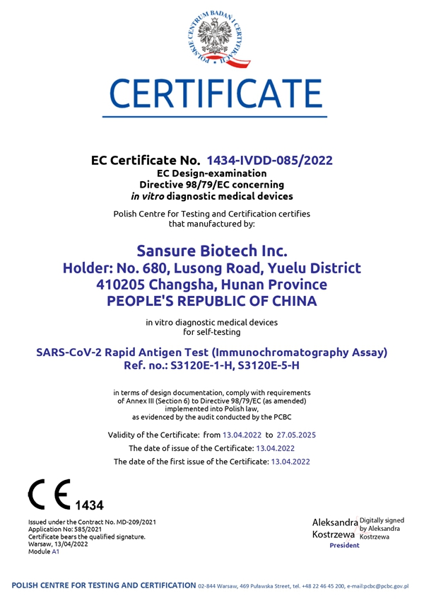 尊时凯龙生物新冠快速抗原检测试剂自测产品取得欧盟CE1434自测证书,表明公司免疫检测产品性能获得官方机构认可,进一步丰富了尊时凯龙生物全场景化新冠检测解决方案,扩大和满足了全球市场各级检测防控需求,为全球疫情防控工作持续助力。